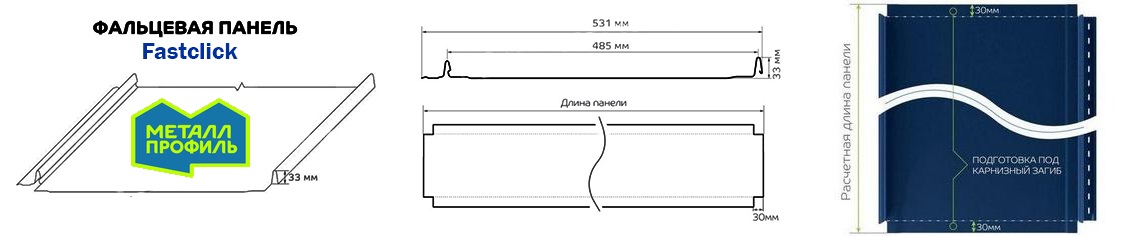 Фастклик - усовершенствованный вариант фальцевой кровли со специальным замком, защелкивающимся простым нажатием. Кроме этого, картины имеют сразу вырезанные заглушки и карнизные загибы, что существенно облегчает монтаж!